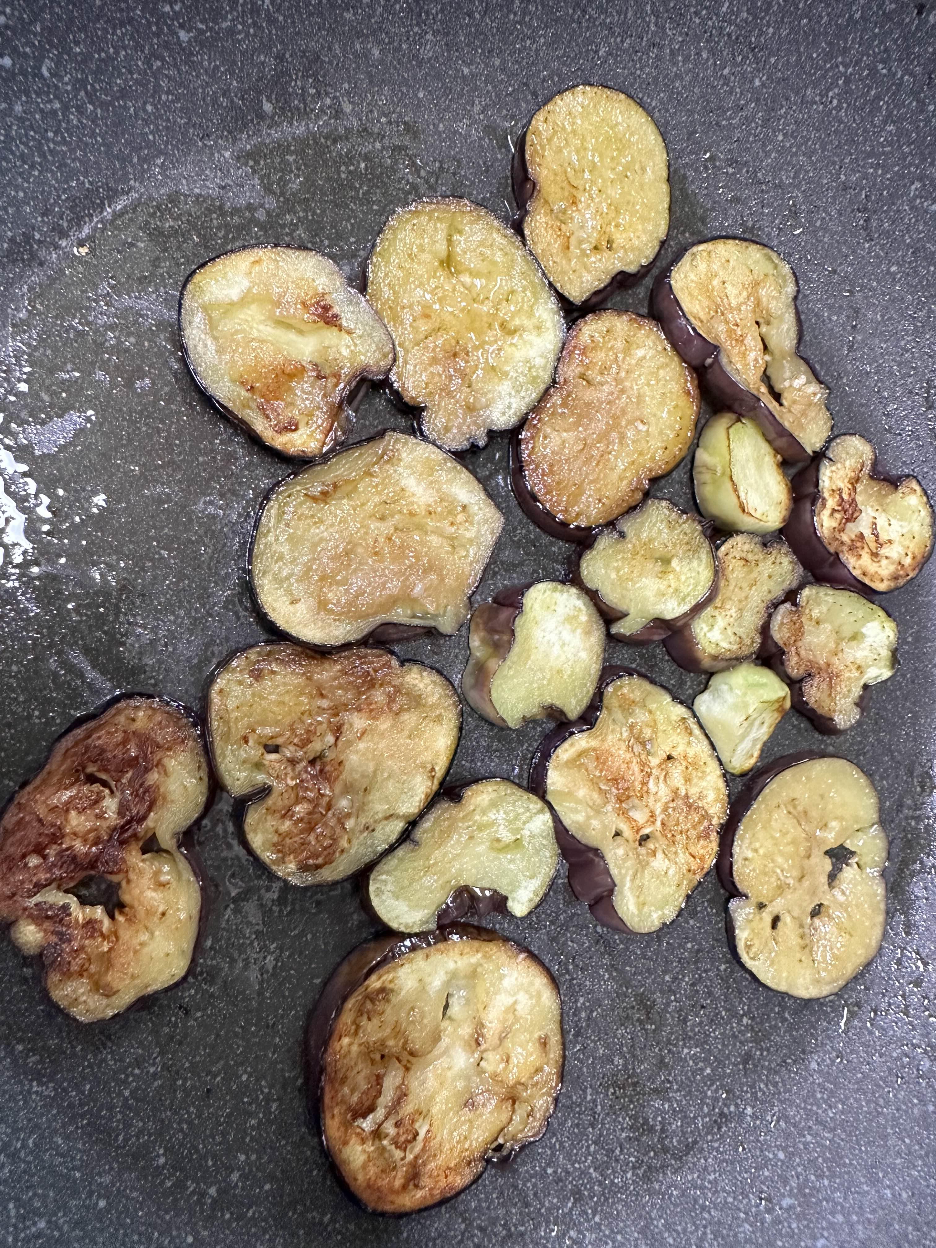가지를 굽게 되면 수분이 빠지면서 모양이 변해요. 하지만 구우면 구울수록 더 맛있는 요리가 된답니다~