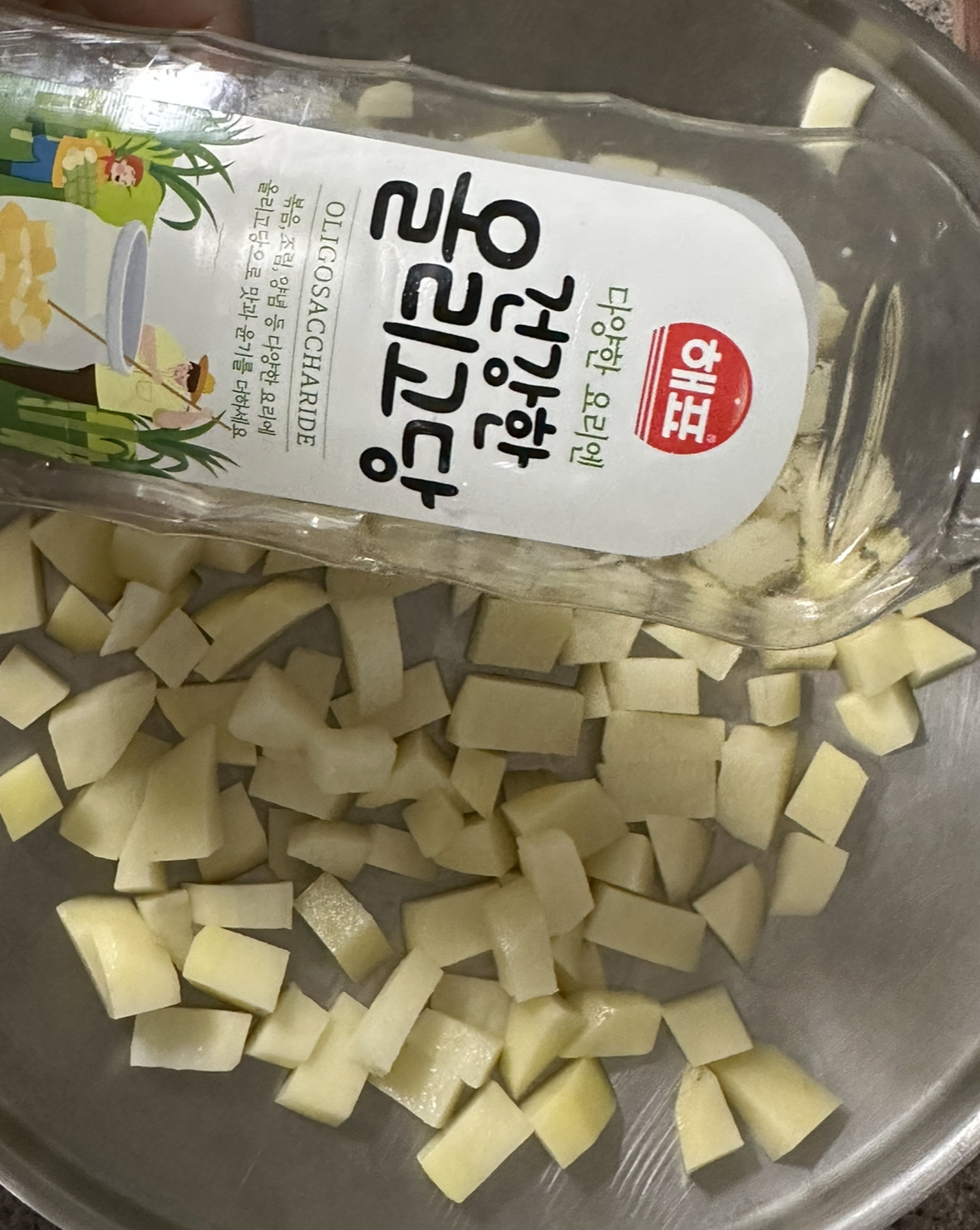 감자 깍둑썰기를 다하고 나면 냄비에 담아주세요.