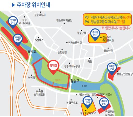주차장 위치는 P1번부터 P6번까지 6개의 장소에 주차가 가능합니다. 아무래도 축제장과 제일 가깝게 주차 가능한 곳은 주차장 P1, P2가 제일 가깝게 이용 가능하고, 청송여자중고등학교와 청송중고등학교는 토요일 일요일 주말만 주차가 가능하니 기억하시어 이용하시길 바랍니다.